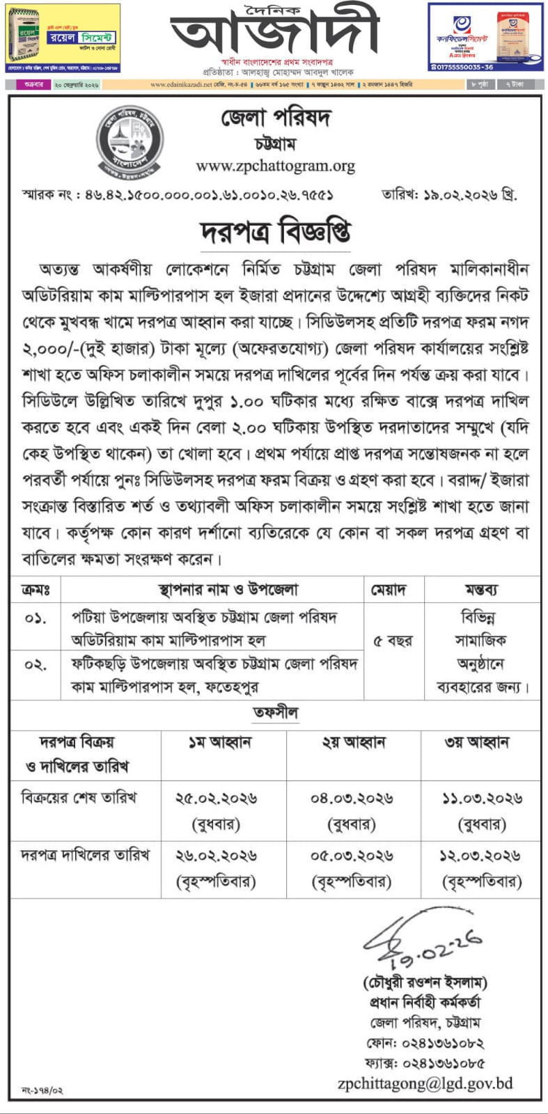 দোকান গৃহ, অডিটরিয়াম ও বাজারশেড ইজারা সংক্রান্ত বিজ্ঞপ্তি