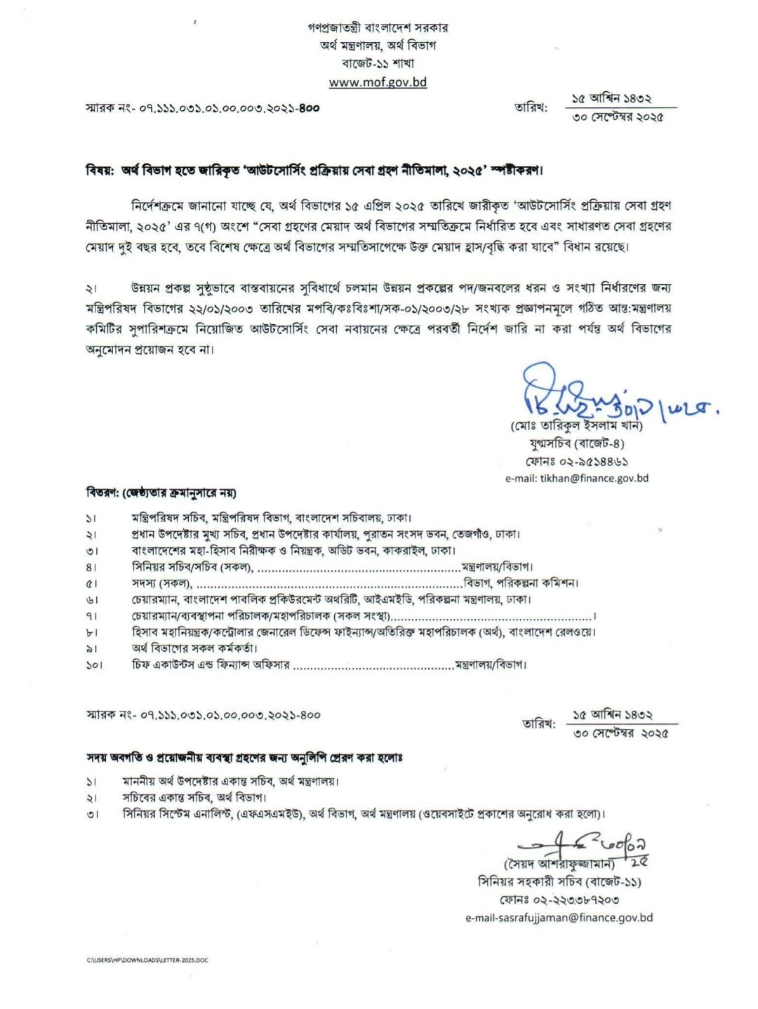 অর্থ বিভাগ হতে জারিকৃত ‘আউটসোর্সিং প্রক্রিয়ায় সেবা গ্রহণ নীতিমালা, ২০২৫’ স্পষ্টীকরণ |