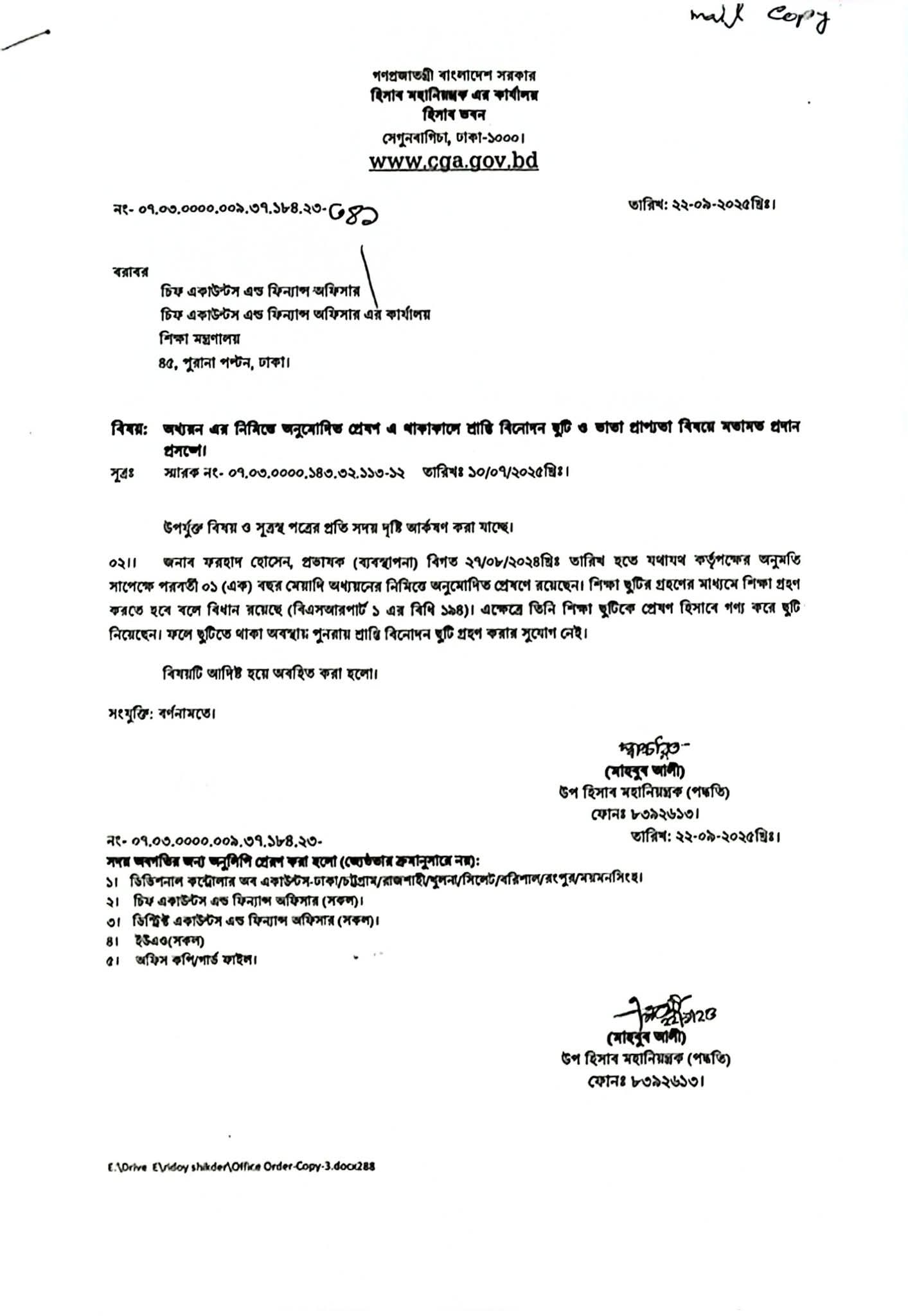 | ১৭৮ | অধ্যয়ন এর নিমিত্তে অনুমোদিত প্রেষণ এ থাকাকালে প্রান্তি বিনোদন ছুটি ও ভাতা প্রাপ্যতা বিষয়ে মতামত প্রদান প্রসঙ্গে | ৩৪১ | ২২.০৯.২০২৫ |